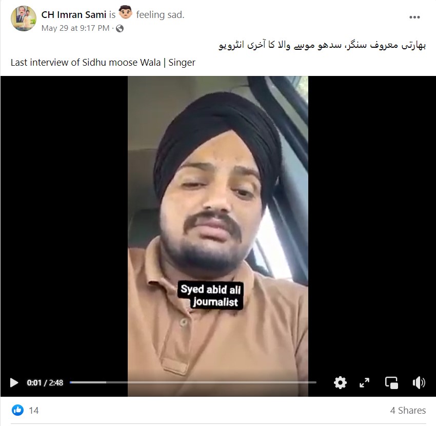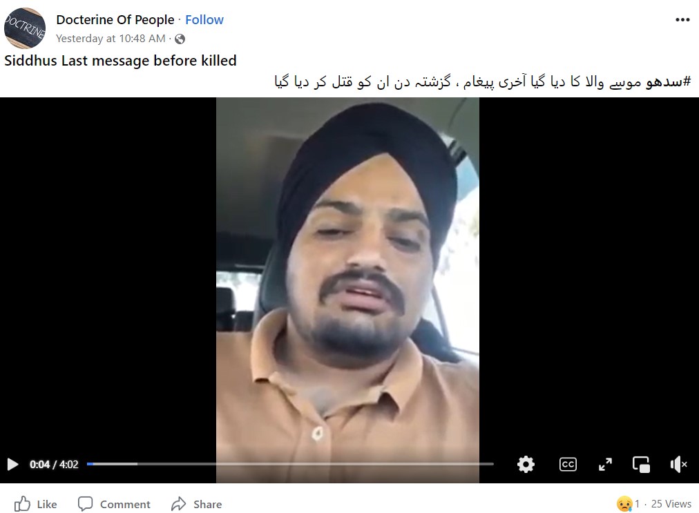 دراصل پنجاب کے مانسا میں پنجابی گلوکار سدھو موسے والا کو اتوار کے دن گولی مار کر ہلاک کر دیا گیا۔ میڈیا رپورٹس کے مطابق سدھو کے قتل کی ذمہ داری گینگسٹر لارینس بشنوئی کے ساتھی گولڈی برار نے لی ہے۔ اب اسی کے پیش نظر پنجابی گلوکار سدھو موسے والا کا آخری انٹرویو بتا کر فیس بک اور یوٹیوب پر شیئر کیا جا رہا ہے۔