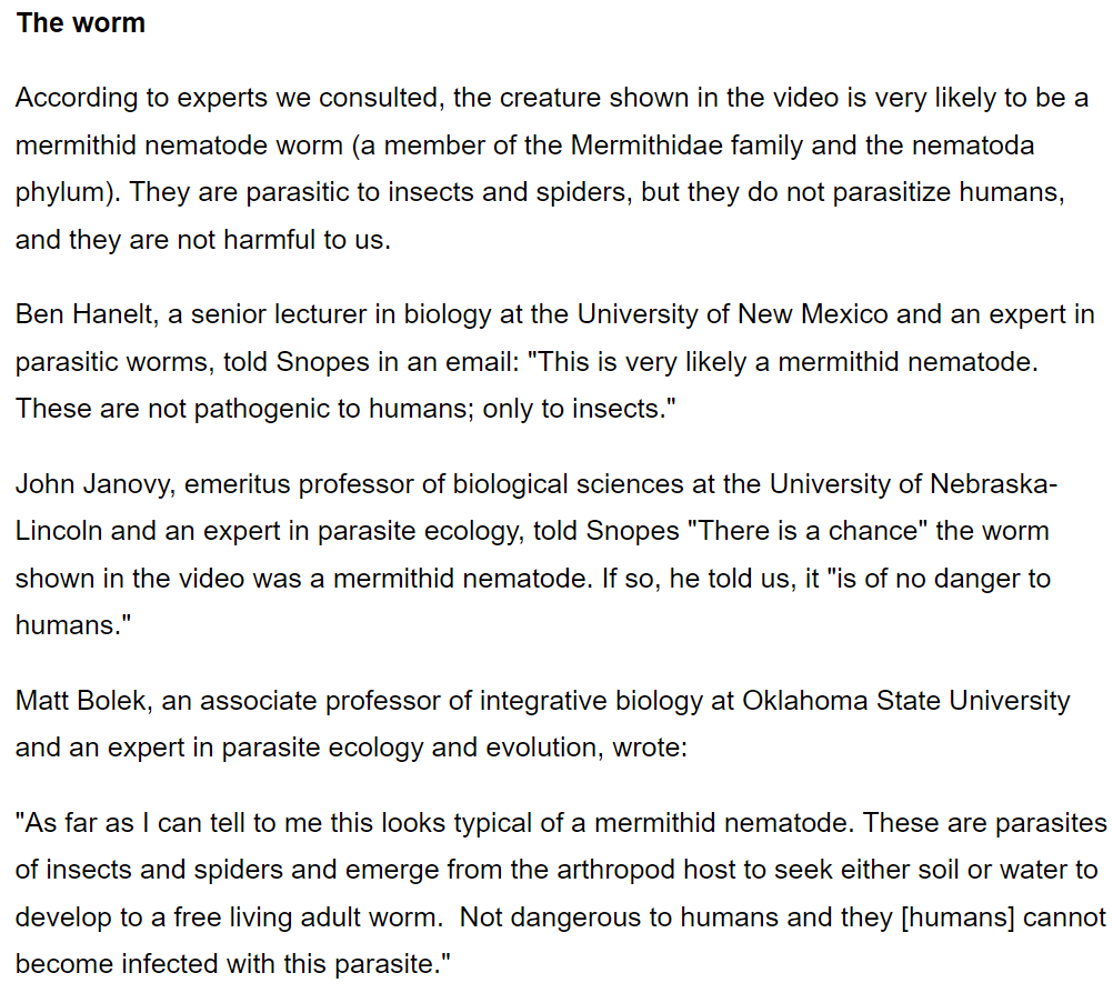 ماہرین کے مطابق ویڈیو میں نظر آ رہی مخلوق سانپ نہیں بلکہ ایک طرح کا کیڑا ہے۔ ویڈیو کے ساتھ کیا گیا دعویٰ گمراہ کن ہے۔