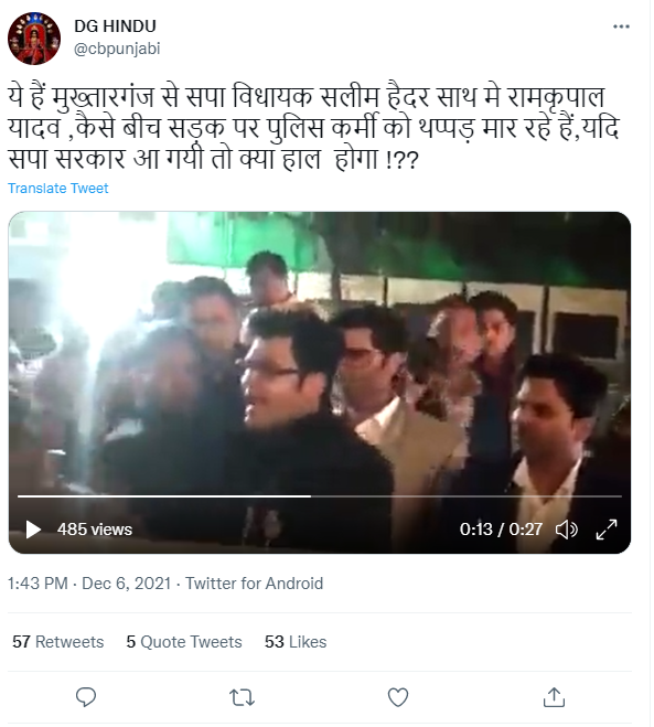 سوشل میڈیا پر پولس کی پٹائی کا ایک ویڈیو شیئر کیا جا رہا ہے۔ جس کے ساتھ صارفین دعویٰ کر رہے ہیں کہ “مختارگنج سے سماج وادی پارٹی کے ایم ایل اے سلیم حیدر نے بیچ سڑک پر ایک پولس ملازم کی پٹائی کی”۔