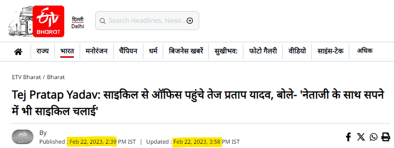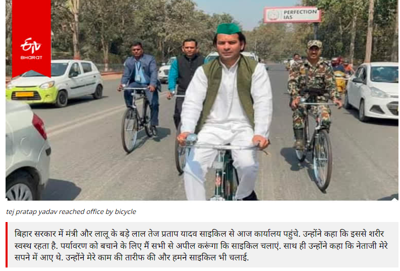 تیج پرتاپ کے سائیکل سے سفر والی ویڈیو کے ایک فریم کو ہم نے سب سے پہلے کیورڈ “تیج پرتاپ سائیکلنگ” کے ساتھ گوگل ریورس امیج سرچ کیا۔ جہاں ہمیں 22 فروری 2023 کو شائع ای ٹی وی بھارت کی ایک رپورٹ موصول ہوئی۔ جس میں تیج پرتاپ کی اس ویڈیو کو والدہ رابڑی دیوی کی رہائش گاہ سے سائیکل چلا کر محکمہ جنگلات کے دفتر آرانیہ بھون پہنچے کا بتایا گیا ہے۔ تیج پرتاپ یادو کی یہ ویڈیو اس وقت کی ہے جب وہ بہار سرکار میں جنگلات ماحولیات اور موسمیاتی تبدیلی کے وزیر تھے ۔