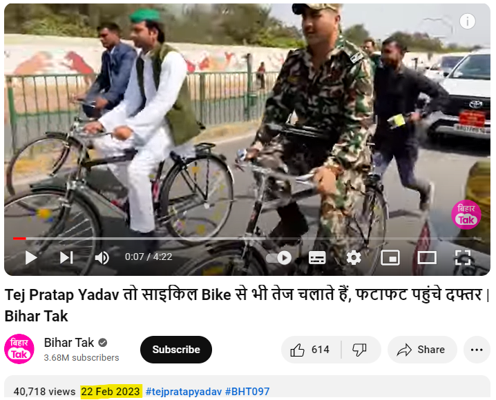 اس کے علاوہ ہمیں بہار تک کے آفیشل یوٹیوب چینل پر 22 فروری 2023 کو اپلوڈ شدہ ایک ویڈیو رپورٹ موصول ہوئی۔ جس میں تیج پرتاپ یادو کو وائرل ویڈیو والے ہوبہو حلیئے میں دیکھا جا سکتا ہے۔ جس سے واضح ہوتا ہے کہ وائرل ویڈیو کا ملک میں جاری انتخابات کے لئے کی جا رہی انتخابی مہم سے کوئی تعلق نہیں ہے۔