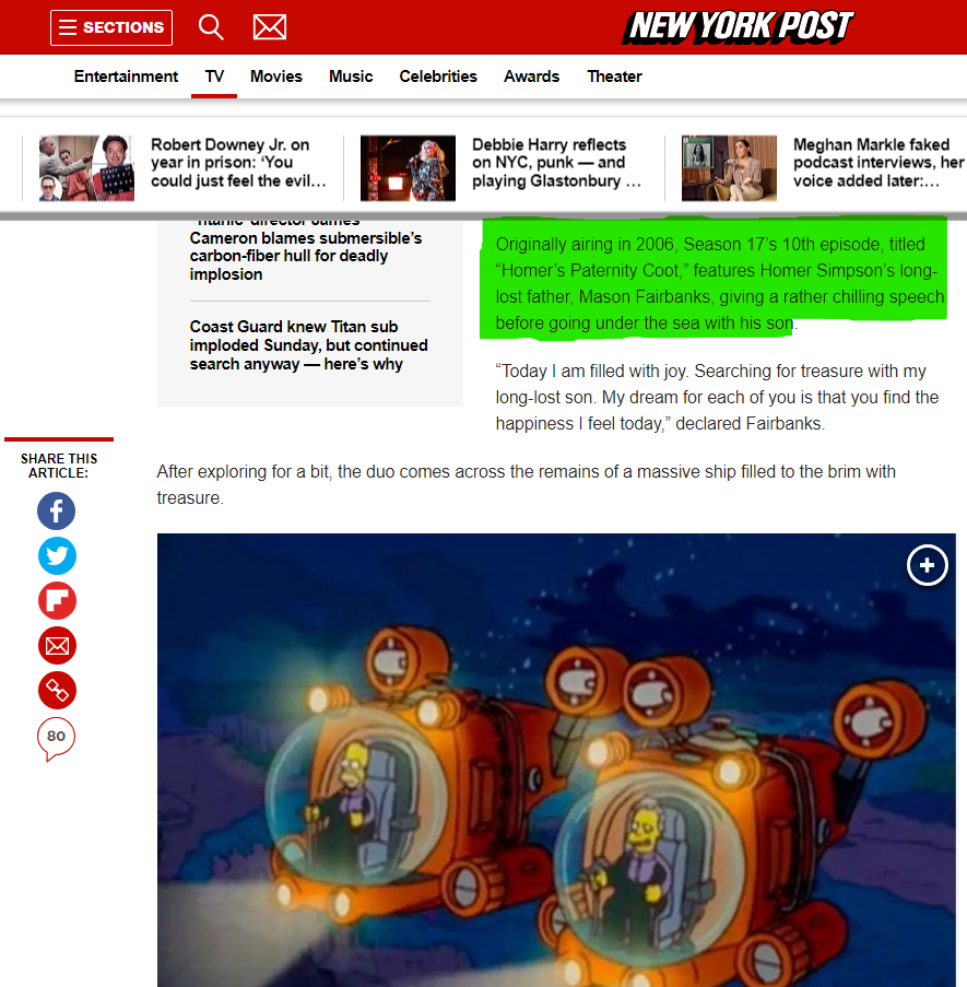 اب اسی حادثے سے منسوب کرکے دی سمپسنز کارٹون کا ایک کلپ شیئر کیا جا رہا ہے اور دعویٰ کیا جا رہا ہے کہ 34 سال پہلے سمپسنز کارٹون کے ذریعے ٹائی ٹن آبدوز کے لاپتہ ہونے کی پیشن گوئی کی جا چکی ہے۔