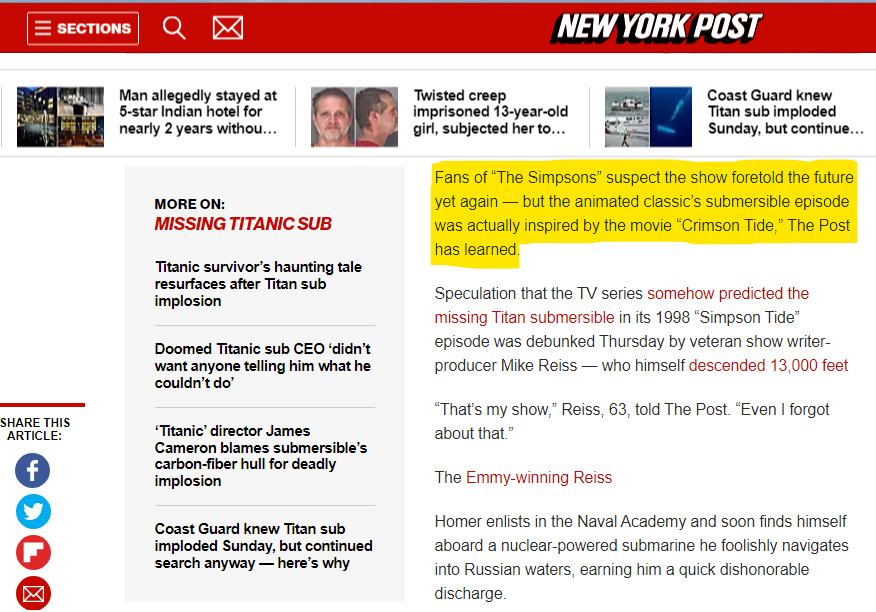 ایک فیس بک صارف نے ویڈیو کے ساتھ کیپشن میں لکھا ہے کہ “امریکہ میں بننے والے تقریباً 34 برس قبل کارٹون کی ٹائی ٹینک کی آبدوز کے حوالے سے پیش گوئی کی ویڈیو سامنے آئی ہے۔ دی سمپسنز کارٹون کی ایک قسط میں نشر کیا گیا تھا کہ باپ اور بیٹا ٹائی ٹینک کا ملبہ دیکھنے سمندر کی تہہ میں گئے اور پھر راستہ بھٹک گئے، جبکہ ان کا رابطہ بھی منقطع ہوگیا”۔
