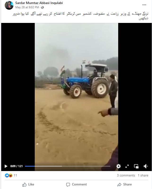 مذکورہ ویڈیو کے ساتھ ایک دوسرے فیس بک صارف نے دعویٰ کیا ہے کہ بھارتی وزیر زراعت کے جموں کشمیر میں ٹریکٹر کا افتتاح کے دوران حادثہ پیش آیا، لیکن ٹریکٹر بغیر ڈرائیور کے چلتی رہی اور وہ بچ گئے۔