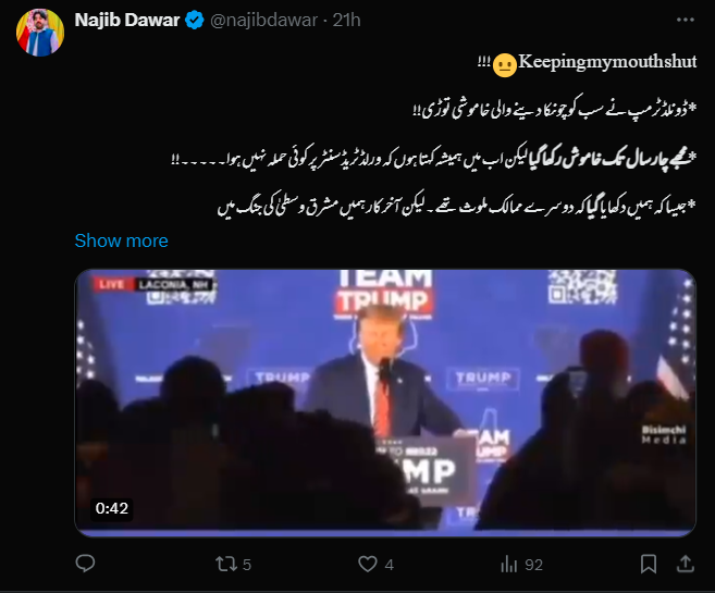 ایک فیس بک صارف نے ویڈیو کے ساتھ کیپشن میں لکھا ہے کہ “ڈونلڈ ٹرمپ آن فائر، ٹرمپ نے امریکی اسٹیبلشمنٹ کی پتلونیں بیچ چوراہے میں اتار دیں ہیں۔ چار سال تک میں نے اپنا منہ بند رکھا لیکن اب میں ہمیشہ کہتا ہوں کہ ورلڈ ٹریڈ سنیٹر پر کوئی حملہ نہیں ہوا، جیسا کہ ہمیں دکھایا گیا کہ دوسرے ممالک ملوث تھے۔ لیکن آخر کار ہمیں مشرق وسطیٰ کی جنگ میں گھسیٹا گیا، ہم نے کھربوں ڈالر خرچ کیے، لاکھوں لوگ مارے اور ہم نے کیا حاصل کیا؟ کچھ نہیں! ہمیں صرف موت اور خون ملا”۔