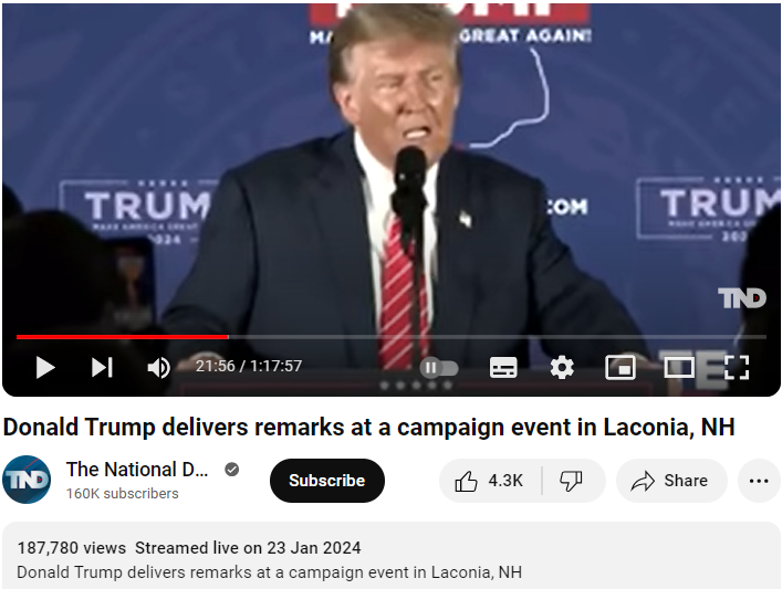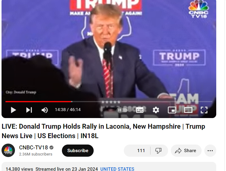 ڈونلڈ ٹرمپ کے ورلڈ ٹریڈ سینٹر سے متعلق دیئے گئے بیان کے ساتھ شیئر کردہ ویڈیو کی حقیقت جاننے کے لئے ہم نے سب سے پہلے ویڈیو کے کنارے نظر آ رہے “لکونیا، این ایچ” کے حوالے سے “ڈونلڈ ٹرمپ اسپیچ ان لکونیا این ایچ” انگریزی کیورڈ سرچ کیا۔ اس دوران ہمیں دی نیشنل ڈیسک و سی این بی سی- ٹی وی 18 کے یوٹیوب چینل پر 23 جنوری 2024 کو اس موقع کا لائیو اسٹریمنگ ویڈیو موصول ہوا۔