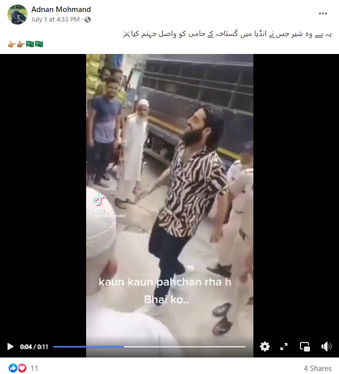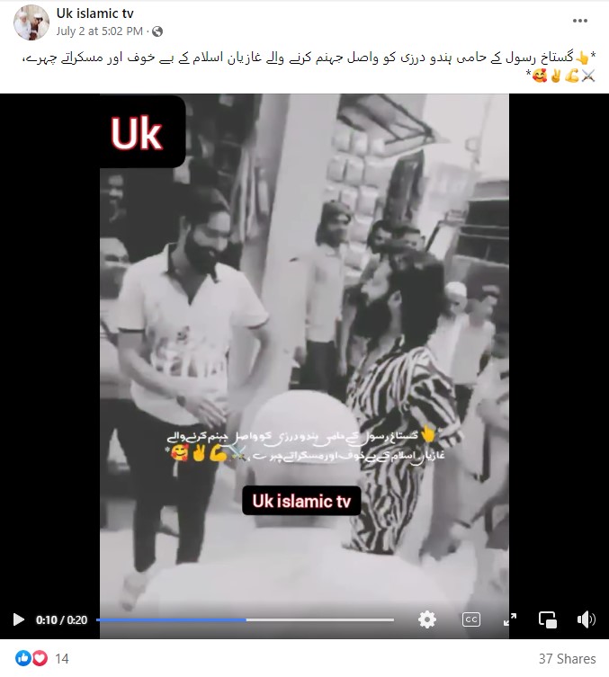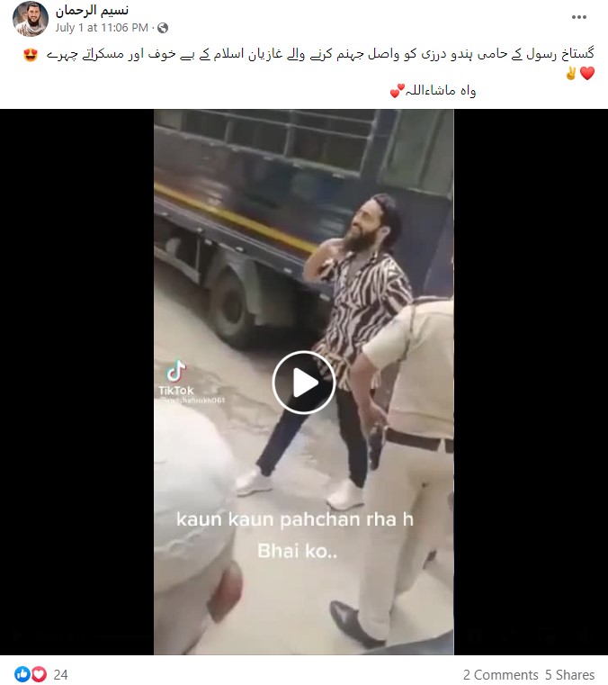 اسی کے پیش نظر ادے پور سانحہ کے ملزموں سے منسوب کرکے ایک ویڈیو فیس بک، ٹویٹر اور یوٹیوب پر خوب شیئر کیا جا رہا ہے۔ ویڈیو میں دیکھا جا سکتا ہے ایک سفید اور کالے رنگ کی شرٹ پہنے شخص کو پولس نے پکڑ رکھا ہے اور وہ شخص اپنے بالوں پر ہاتھ پھیرتے ہوئے مسکرا رہا ہے۔ جسے سوشل میڈیا صارفین ادے پور کے مقتول درزی کنہیالال کا قاتل بتاکر شیئر کر رہے ہیں۔ ایک صارف نے کیپشن میں لکھا ہے کہ”یہ ہے وہ شیر جس نے انڈیا میں گستاخہ کے حامی کو واصل جہنم کیا”۔