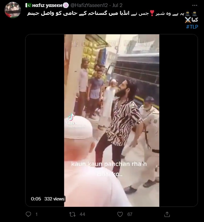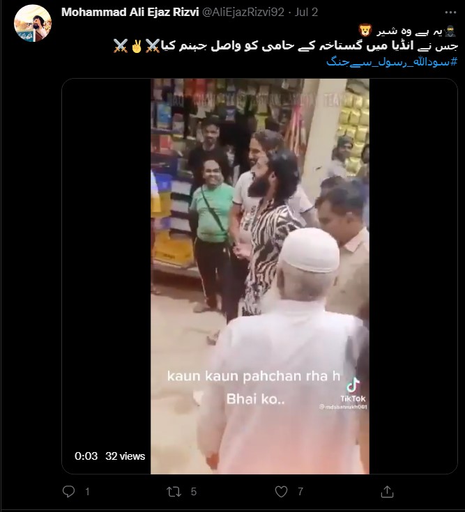 سوشل نٹورکنگ سائٹس پر ایک ویڈیو خوب گردش کر رہی ہے۔ ویڈیو سے متعلق صارفین کا دعویٰ ہے کہ ویڈیو میں پولس کی گرفت میں مسکراتا ہوا نظر آ رہا شخص ادے پور کے مقتول درزی کا ملزم ہے۔ ویڈیو کے کیپشن میں ایک ٹویٹر صارف نے لکھا ہے کہ “گستاخ رسول کے حامی ہندو درزی کو واصل جہنم کرنے والے غازیان اسلام کے بے خوف اور مسکراتے چہرے”۔ بتادوں کہ اس ویڈیو کو مذکورہ کیپشن کے ساتھ زیادہ تر پاکستانی صارفین شیئر کر رہے ہیں۔