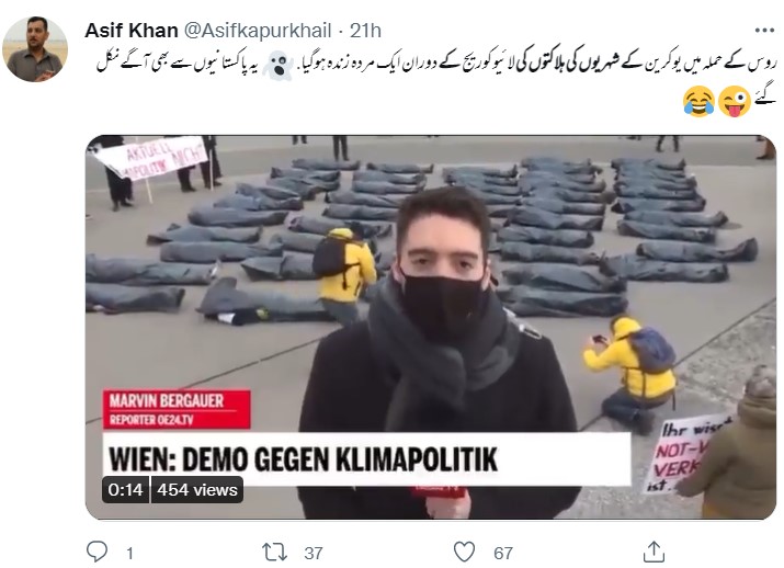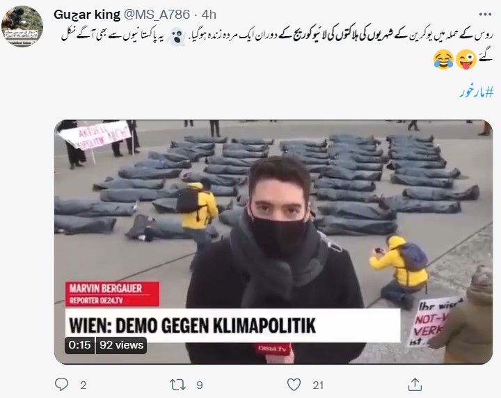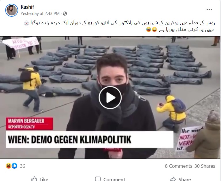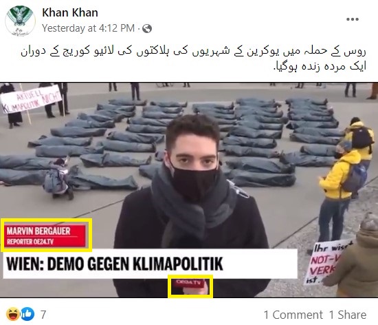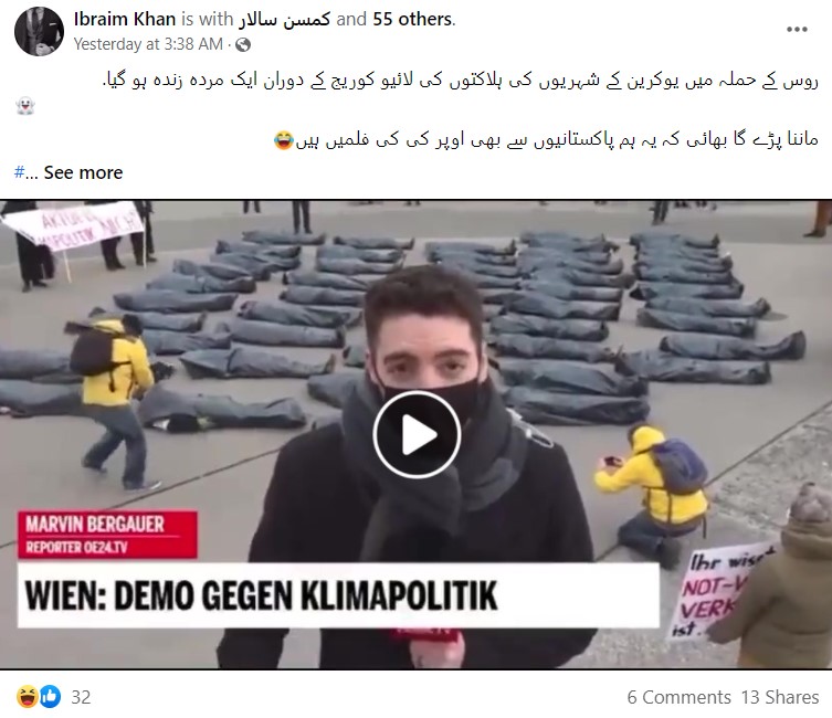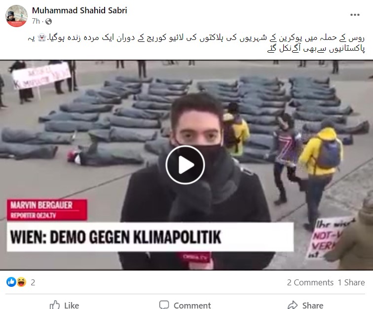 نیوز چیکر کی تحقیقات میں پتا چلا کہ روس کے یوکرین پر حملہ کرنے سے بہت پہلے شائع ہونے والی ایک غیر متعلقہ ویڈیو کو سیاق و سباق سے ہٹ کر استعمال کیا جا رہا ہے۔ جس کے ساتھ یہ دعویٰ کیا جا رہا ہے کہ “یوکرینی میڈیا لائیو کوریج کی ویڈیو رپورٹ میں جعلی ہلاکتیں دکھا رہا ہے”۔ درحقیقت یہ منظر 4 فروری 2022 کے ہیں، جنہیں آسٹریا میں موسمیاتی تبدیلی کے خلاف شہریوں کے احتجاج کے دوران ریکارڈ کیا گیا تھا۔