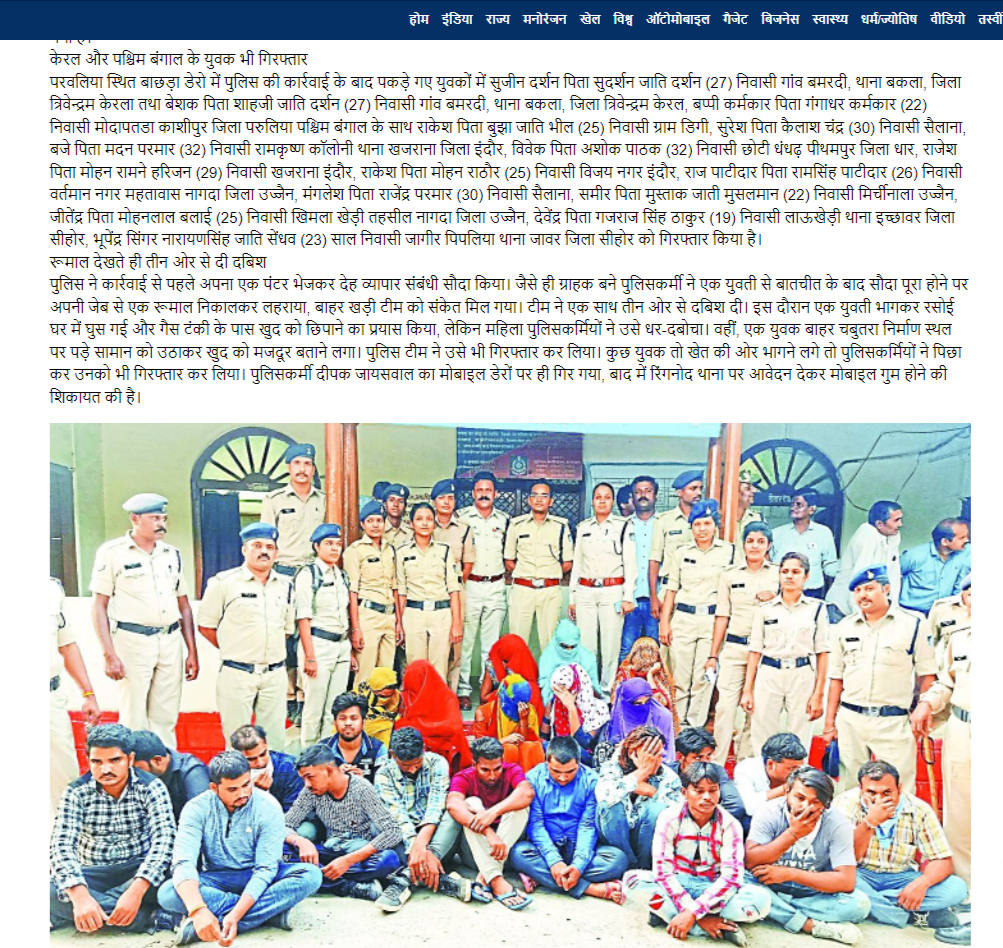 کولاج میں پولیس کے ساتھ بیٹھے نوجوان لڑکے اور لڑکیوں کی تصویر کی سچائی جاننے کے لیے ہم نے اسے گوگل پر تلاشنا شروع کیا۔ اس عمل میں ہمیں پتریکا پر 15 جولائی 2019 کو شائع شدہ ایک رپورٹ موصول ہوئی۔ جس کے مطابق مدھیہ پردیش کے رتلام میں پولیس نے جسم فروشی میں ملوث 9 لڑکیوں اور 15 لڑکوں کو گرفتار کیا تھا۔ بتادیں کہ روزنامہ بھاسکر اور مندسور سندیش پر شائع کردہ مضامین میں بھی وائرل تصویر کو رتلام کا ہی بتایا گیا ہے۔