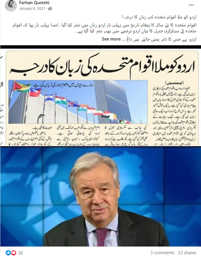 سوشل میڈیا پر اردو نیوز پیپر کی ایک کٹنگ خوب گردش کررہی ہے۔ جس کی ہیڈلائن میں لکھا ہے کہ “اردو کو ملا اقوام متحدہ کی زبان کا درجہ” بقیہ خبر کچھ یوں ہے”اردو اب اقوام متحدہ کی سرکاری زبان بن گئی ہے۔ تاریخ میں پہلی بار اقوام متحدہ کے سکریٹری جنرل کا اردو زبان میں پیغام جاری کیا گیا ہے۔ یہ ایک خوش آئند خبر ہے۔ اس طرح اردو اب ایک عالمی زبان بن گئی ہے۔ درجہ ذیل میں وائرل پوسٹ کے آرکائیو لنک موجود ہیں۔