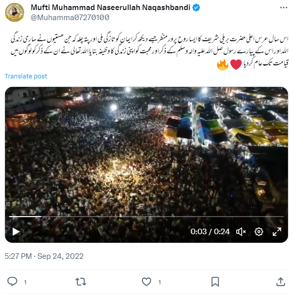اس کے علاوہ رضا اکیڈمی کے آفیشل فیس بک پیج پر وائرل ویڈیو کا پہلا حصہ ملا۔ جسے 23 ستمبر 2022 کو بریلی شریف کے اسلامیہ انٹر کالج میں ہونے والے عرس رضوی کا بتایا گیا ہے۔