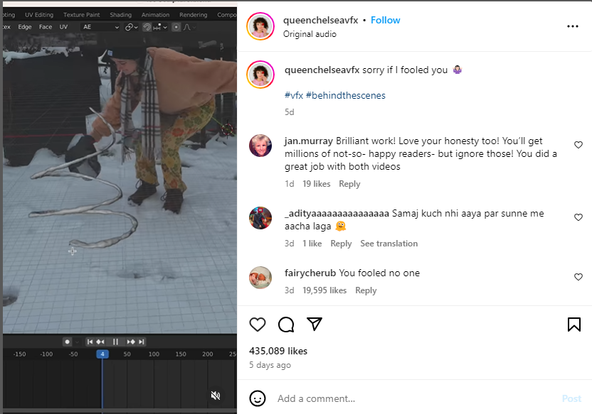 پھر ہم نے ان کے پروفائل کو دیکھا تو پتا چلاکہ قوین چلسیا وی ایف ایکس ایک ویژول ایفیکٹ آرٹسٹ ہیں۔ انہوں نے رواں ماہ کی 11 تاریخ کو وائرل ویڈیو بھی شیئر کیا تھا۔ جس کے کیپشن میں ورلڈس لانگیسٹ آئیسکل اور ہیش ٹیگ وی ایف ایکس کا استعمال کیا گیا تھا۔