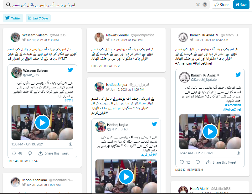 ان دنوں سوشل میڈیا پر 1 منٹ 40 سیکینڈ کا ویڈیو خوب گردش کر رہا ہے۔ ایسا معلوم ہوتا ہے کہ غیر ملکی افسران کسی بڑے پروگرام میں شرکت کرنے آئیں ہیں۔ اس ویڈیو سے متعلق یوزرس کا دعویٰ ہے کہ نئے امریکی پولس چیف نے بائیبل کی قسم اٹھانے سے منع کردیا اور قرآن پاک پر ہاتھ رکھ کر اپنے عہدے کا حلف لیا۔ اس ویڈیو کو مختلف زبان میں اسی کیپشن کے ساتھ شیئر کیا جا رہا ہے۔ جسے آپ درج ذیل میں دیکھ سکتے ہیں۔