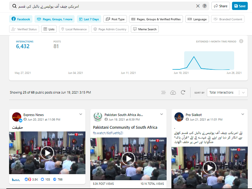 کراؤڈ ٹینگل پر جب ہم نے وائرل ویڈیو کے ساتھ کیے گئے دعوے سے متعلق کیورڈ سرچ کیا تو ہمیں پتا چلا کہ اس موضوع پر پچھلے سات دنوں میں 6,432 فیس بک یوزرس تبادلہ خیال کر چکے ہیں۔ جبکہ ٹویٹر پر بھی اس ویڈیو کو مذکورہ دعوے کے ساتھ متعدد یوزرس نے شیئر کیا ہے۔ جس کا اسکرین شارٹ آپ درج ذیل میں دیکھ سکتے ہیں۔