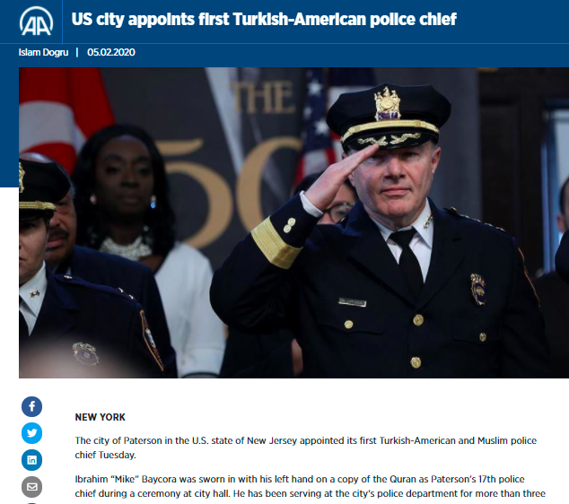 سرچ کے دوران ہمیں آناڈولو ایجنسی نامی ویب سائٹ پر ابراہیم کے حوالے سے معلومات حاصل ہوئی۔ اس رپورٹ میں بتایا گیا ہے کہ ابراہیم نے 4 فروری 2020 کو سٹی آف پٹرسن کے سترہ ویں پولس چیف کی حیثیت سے حلف لیا تھا۔ وہ اس عہدے پر فائز ہونے والے پہلے تُرکی نژاد مسلم افسر ہیں۔ بتادوں کہ ابراہیم بچپن میں ہی اپنے والدین کے ساتھ ترکی سے سٹی آف پٹرسن آگئے تھے۔