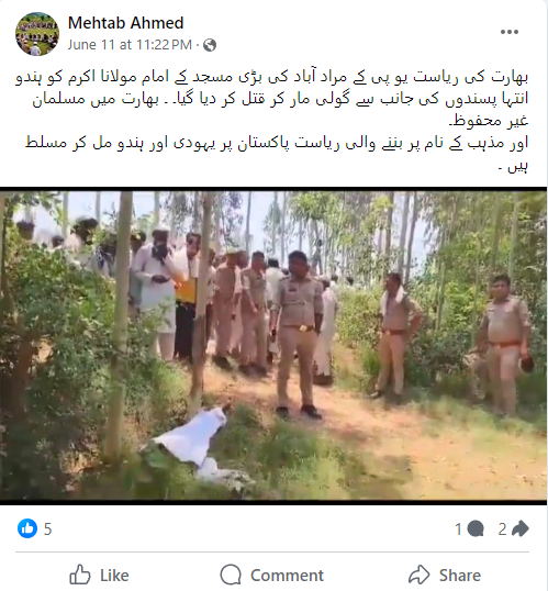 سوشل نٹورکنگ سائٹس فیس بک اور مستند ایکس ہینڈلس سے ایک ویڈیو شیئر کی جا رہی ہے، جس میں زمین پر سفید کپڑے میں ایک لاش نظر آرہی ہے اور ساتھ ہی ویڈیو میں لاش کے اردگرد پولس اہلکاروں اور لوگوں کے جم غفیر کو دیکھا جا سکتا ہے۔ صارفین کا دعویٰ ہے کہ یہ ویڈیو اتر پردیش کے مرادآباد کی ہے۔ جہاں بڑی مسجد کے امام مولانا اکرم کو ہندو شرپسندوں نے گولی مارکر قتل کر دیا ہے۔