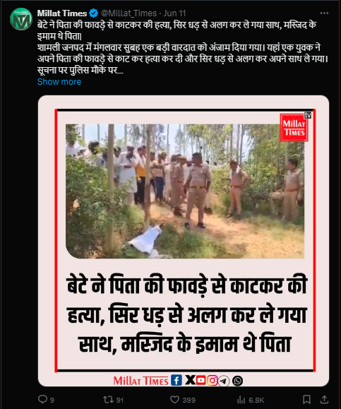 ہم نے وائرل ویڈیو کو اویسم اسکرین شارٹ کی مدد سے کیفریم میں تقسیم کیا اور ان میں سے چند فریم کو گوگل لینس پر سرچ کیا۔ جہاں ہمیں 11 جون کو شیئر شدہ ملت ٹائمس کے آفیشل ایکس ہینڈل پر ہوبہو تصویر والا پوسٹ ملا۔ جس کے مطابق یہ معاملہ اترپردیش کے شاملی کا ہے۔ جہاں بیٹے نے باپ کا سر پھاؤڑے سے الگ کردیا۔ مقتول مسجد کے امام تھے۔