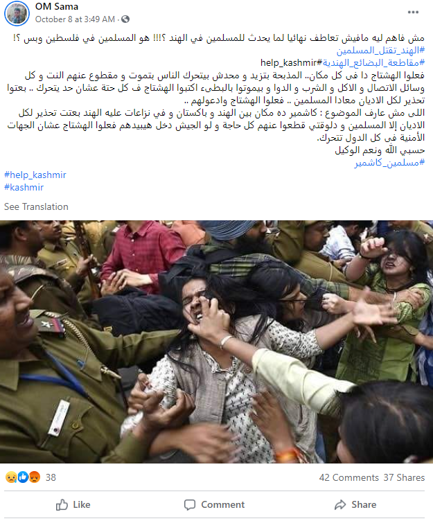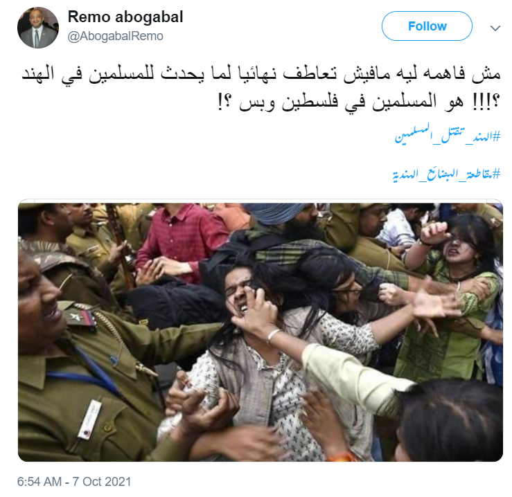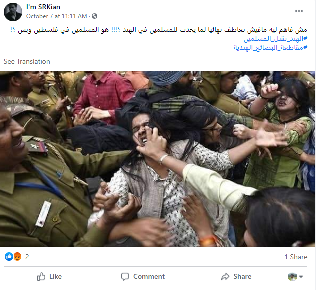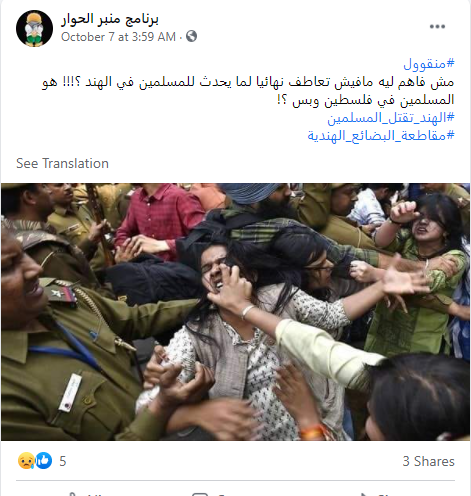سوشل میڈیا پر خاتون کے ساتھ زد و کوب کی ایک تصویر خوب گردش کر رہی ہے۔ صارفین اس تصویر کو فرقہ وارانہ فساد سے جوڑ کر بھٰی شیئر کر رہے ہیں۔ تصویر میں ایک خاتون پر پولس اور کچھ لوگ تشدد کرتے ہوئے نظر آرہے ہیں۔ تصویر کے ساتھ کیپشن میں ہیش ٹیگ “الهند_تقتل_المسلمين اور مقاطعة_البضائع_الهندية” استعمال کیا گیا ہے اور ساتھ ہی لکھا ہے کہ ‘مجھے سمجھ میں نہیں آرہا ہے کہ بھارت کے مسلمانوں کے ساتھ کیا ہو رہا ہے، ان کے ساتھ ہمدردی کیوں نہیں برتی جا رہی ہے۔ کیا صرف فلسطین ہی میں مسلمان ہیں؟
