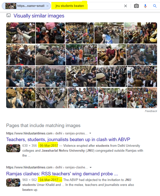 خاتون کے ساتھ زد و کوب کی وائرل تصویر کو ہم نے سب سے پہلے گوگل ریورس امیج سرچ کیا۔ اس دوران ہمیں اسکرین پر انگلش میں “جے این یو کے طلباء کو مارا گیا” لکھا ہوا نظر آیا اور وائرل تصویر سے متعلق کئی پرانی رپورٹس کے لنک بھی فراہم یوئے۔ جس کا اسکرین شارٹ درج ذیل میں دیکھ سکتے ہیں۔