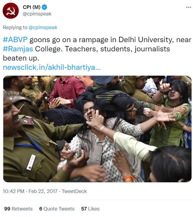 کیورڈ سرچ کے دوران ہمیں سی پی آئی کے آفیشل ٹویٹر ہنڈل پر وائرل تصویر ملی۔ جس کے مطابق اے بی وی پی کے لوگوں نے دہلی یونیورسٹی میں رامجس کالج کے نزدیک ہنگامہ کیا تھا اور طلباء، اساتذہ اور صحافیوں کو مارا پیٹا تھا، اسی کی یہ تصویر ہے۔