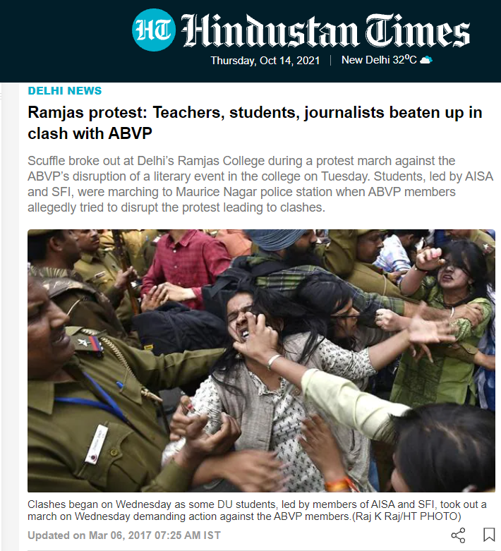 ہندوستان ٹائمس پر ہمیں وائرل تصویر کے ساتھ شائع شدہ مارچ 2017 کی ایک خبر ملی۔ لیکن تصویر کہاں کہ ہے یہ واضح نہیں کیا گیا ہے۔ البتہ رپورٹ میں یہ ضرور واضح کیا گیا ہے کہ دہلی یونیورسٹی کے رامجس کالج میں پروگرام کے دوران اے بی وی پی کے لوگوں نے ہنگامہ کیا تھا۔ جس کے بعد ایس ایف آئی اور اے آئی ایس اے کے لوگوں نے احتجاج کیا تھا۔ لیکن تصویر کے سلسلے میں کوئی پختہ ثبوت پیش نہیں کیا گیا ہے۔
