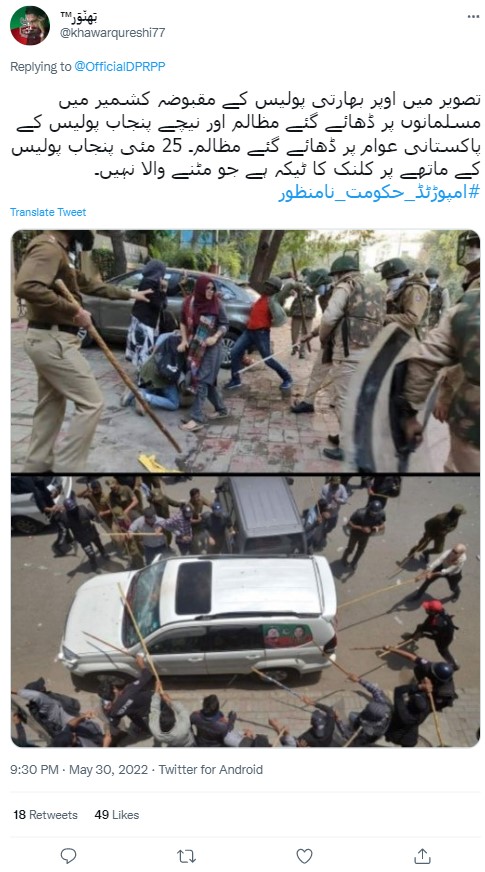 پچیس مئی 2022 کو پاکستان کے سابق وزیر اعظم عمران خان کی پارٹی کی جانب سے ‘حقیقی آزادی’ لانگ مارچ کیا گیا تھا۔ میڈیا رپورٹ کے مطابق لانگ مارچ کے دوران پاکستان تحریک انصاف کے سیکڑوں کارکنان کو گرفتار کیا گیا اور ان پر لاٹھی بھی برسائی گئی، مظاہرے کے دوران ہلاکت کی بھی خبر ہے۔ اسی کے پیش نظر دو تصویروں پر مشتمل ایک کولاج سوشل میڈیا پر وائرل ہو رہا ہے۔ صارفین کا دعویٰ ہے کہ پہلی تصویر جس میں پولس اہلکار لڑکے اور لڑکیوں پر لاٹھی برسا رہے ہیں وہ جموں کشمیر کی ہے، جبکہ دوسری تصویر پاکستان کی ہے۔