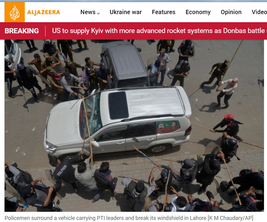 ہم نے جب دوسری تصویر کو کروپ کرکے ریورس امیج سرچ کیا۔ اس دوران ہمیں الجزیرہ پر شائع 25 مئی 2022 کی رپورٹ ملی۔ جس میں گاڑی پر حملے والی تصویر کو لاہور میں پولس کی جانب سے پی ٹی آئی رہنماؤں کو لے جانے والی گاڑی پر کئے گئے حملے کا بتایا گیا ہے۔ یہی تصویر ہمیں پاکستان کی دنیا نیوز کے آفیشل ٹویٹر ہینڈل پر بھی ملی۔