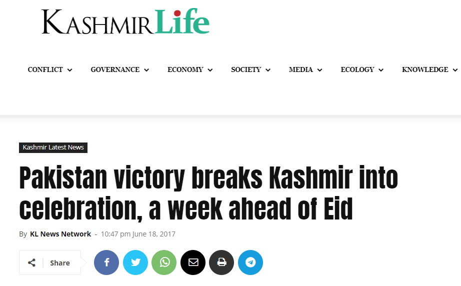 مزید سرچ کے دوران کچھ نہ ملنے کے بعد ہم نے بھارت پاکستان میچ سے متعلق چند کیورڈ سرچ کیے۔ سرچ کے دوران ہمیں کشمیر کے معروف اخبار کشمیر لائف کی 18 جون 2017 کو شائع ایک رپورٹ ملی جس میں پاکستان کی جیت کی خوشی میں جشن مناتے ہوئے ایک تصویر ملی۔ تصویر کے ساتھ رپورٹ میں لکھا گیا ہے کہ ‘کشمیر میں پاکستان کی جیت عید سے ایک ہفتے قبل جشن میں بدل گئی’۔