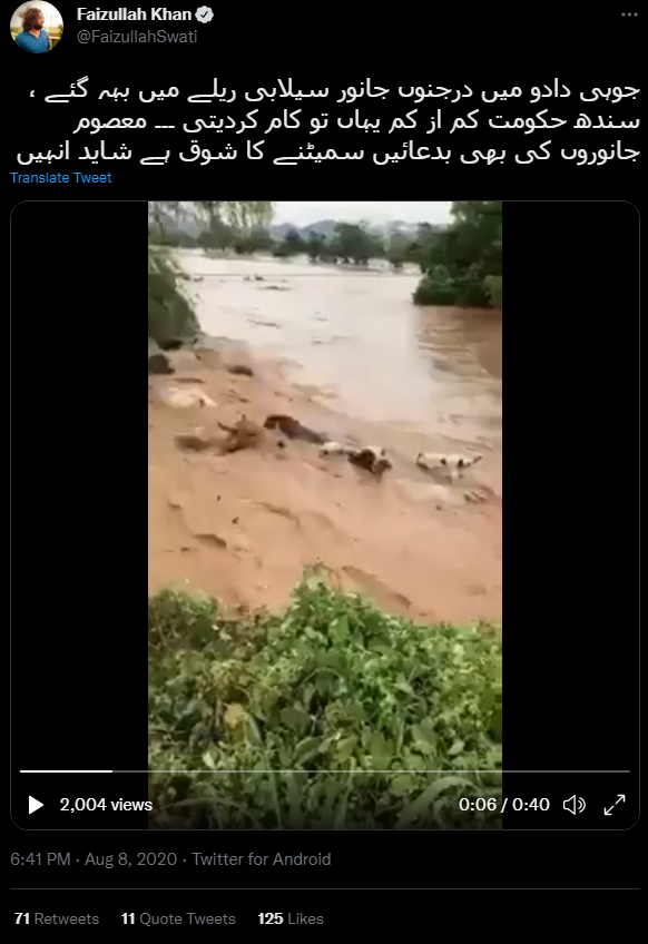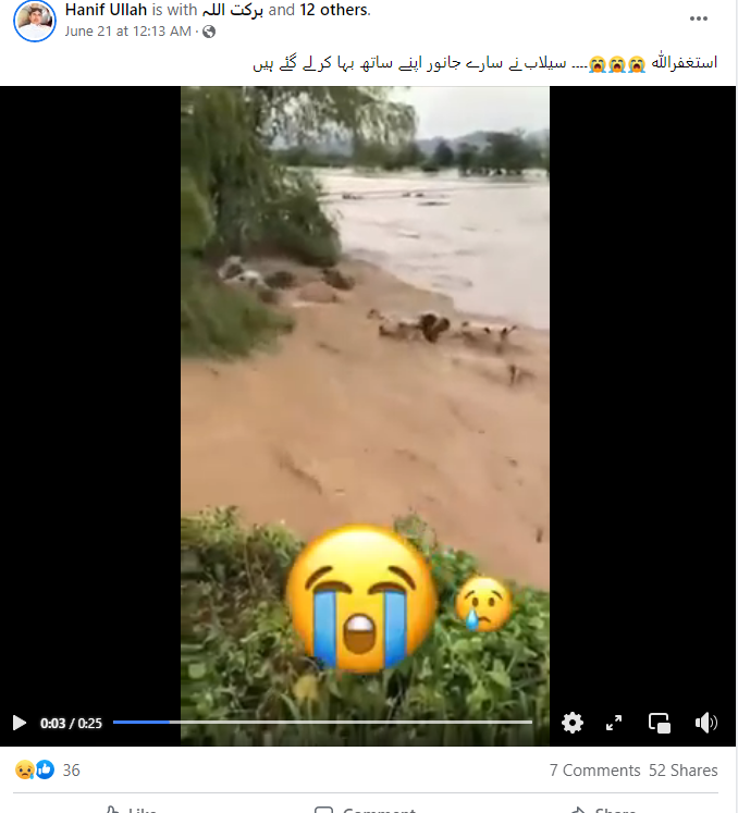 پانی میں بہتے ہوئے جانوروں کی ویڈیو کو ایک دوسرے فیس بک صارف نے بھی شیئر کیا ہے اور کیپشن میں لکھا ہے کہ “استغفرالله۔۔۔۔۔ سیلاب سارے جانور اپنے ساتھ بہا کر لے گئے ہیں”۔