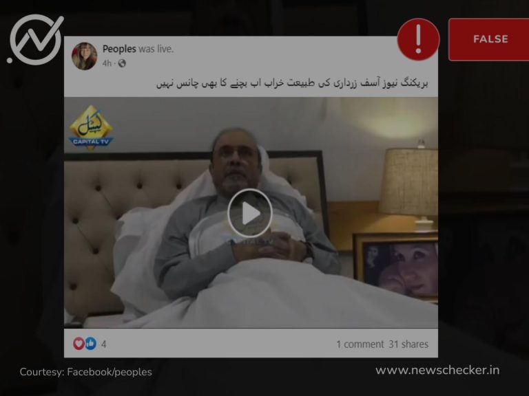 پاکستان کے سابق صدر آصف ذرداری کا ایک ویڈیو پیغام سوشل میڈیا پر وائرل ہورہا ہے، جس سے متعلق صارفین کا دعویٰ ہے کہ وہ علیل ہیں اور ان کے بچنے کی کوئی امید نہیں ہے۔جبکہ تحقیقات سے واضح ہوا کہ آصف ذرداری ٹھیک ہیں۔ لہذا وائرل ویڈیو پرانی ہے اور ان کی خراب صحت سے متعلق کیا جارہا دعویٰ بے بنیاد ہے۔بقیہ رپورٹ یہاں پڑھیں۔
