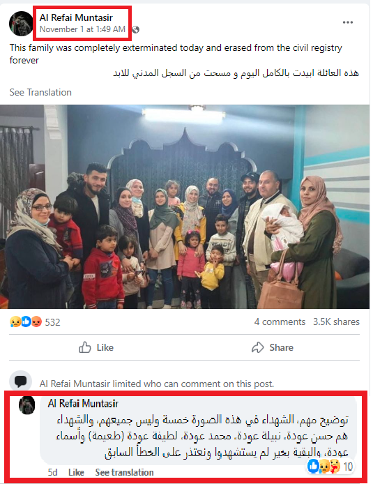 اسرائیلی حملے میں ایک ہی خاندان کے 42 لوگوں کے شہید ہونے کا بتاکر شیئر کی گئی تصویر کو سب سے پہلے ہم نے گوگل ریورس امیج سرچ کیا۔ جہاں ہمیں ہوبہو تصویر 1 نومبر کو یروشلم کے الرفعی منتصر نامی صارف کے فیس بک پوسٹ میں ملی۔ جس کے کمنٹ باکس میں صارف نے واضح کیا ہے کہ تصویر میں نظر آرہے تمام لوگ اسرائیلی حملے میں شہید نہیں ہوئے ہیں، بلکہ ان میں سے محض پانچ افراد شہید ہوئے ہیں، باقی کے لوگ باحیات ہیں۔ مرنے والوں کے نام حسن عودة، نبيلة عودة، محمد عودة، لطيفة عودة (طعيمة) وأسماء عودة ہیں۔