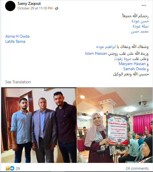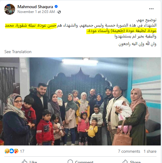 اے ایف سی این میمبر فاطمہ بنی احمد نے فیس بک کیورڈ سرچ میں پایا کہ غزہ کے کچھ صارفین نے تصدیق کی ہے کہ وائرل تصویر میں نظر آ رہے افراد میں سے 5 لوگ ہلاک ہوئے تھے، جن کا تعلق عودہ خاندان سے تھا۔ مزید ایک فیس بک پوسٹ ملی جس میں عودہ خاندان کے کچھ افراد نے تصویر میں نظر آ رہے افراد کے فیس بک اکاونٹ بھی شیئر کئے ہیں۔