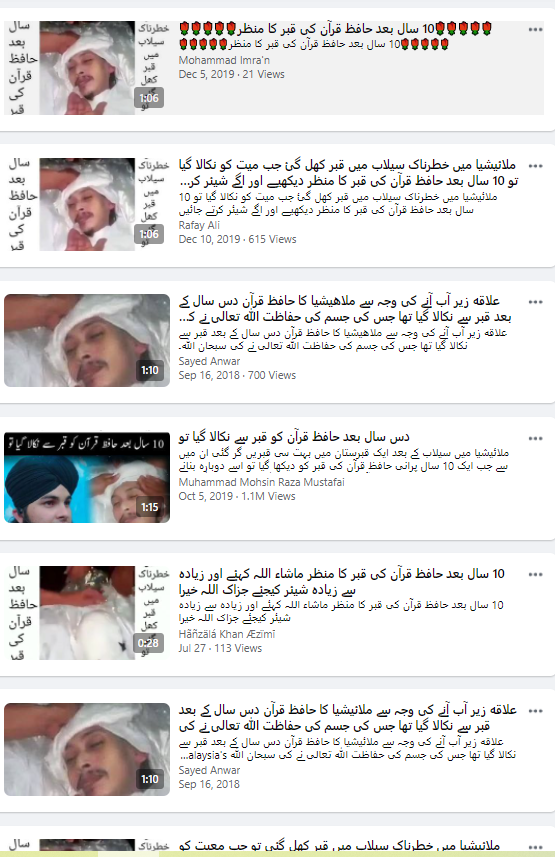 فیس بک پر 1منٹ 6 سیکینڈ کے ویڈیو کے ساتھ دعویٰ کیا جا رہا ہے کہ ملیشیاء میں 10 سال بعد حافظ قرآن کی لاش قبر میں محفوظ ملی۔ دراصل سیلاب آنے کی وجہ سے قبر کھل گئی تھی، جب لاش کو باہر نکالا گیا تو مردہ بالکل تازہ تھا۔