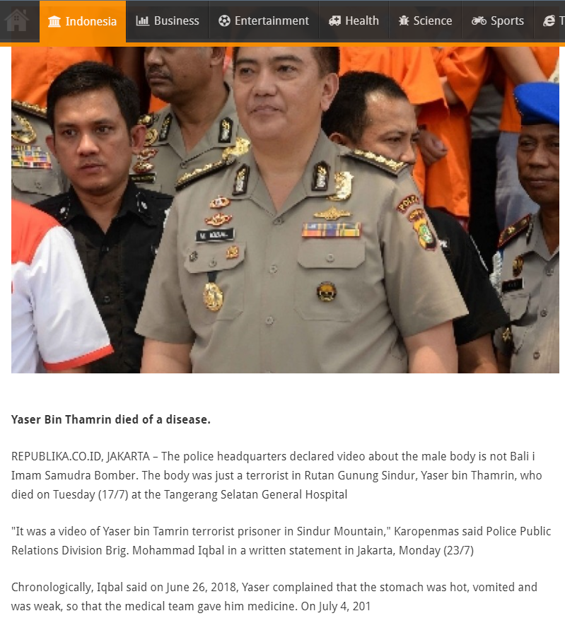 سرچ کے دوران ہمیں انڈو نیشین پولس کے آفیشل فیس بک پیج پر 24 جولائی 2018 کو اپلوڈ شدہ وائرل ویڈیو ملا۔ جس میں دی گئی جانکاری کے مطابق یہ لاش امام سمدرا کی نہیں ہے بلکہ یاسر بن ثمرین کی ہے۔ جو ایک دہشت گرد تھا اور بوگور، مغربی جاوا کے گنونگ سیندور جیل میں قید تھا۔ یاسر کی موت 17 جولائی 2018 ساؤتھ ٹینگرینگ ریجنل جنرل اسپتال میں بیماری کی وجہ سے ہوئی تھی۔