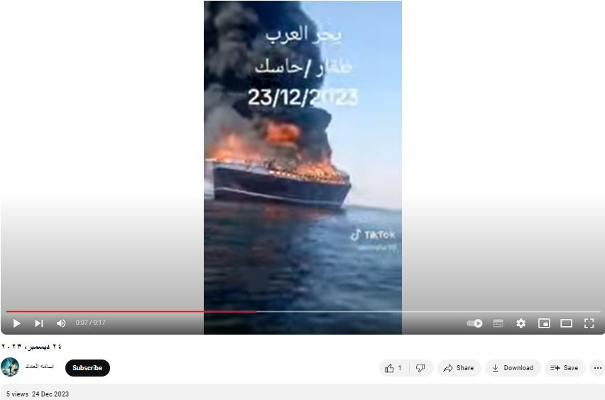 ان دنوں سوشل میڈٰیا پر بحری جہاز کی مختلف تصاویر اور ویڈیو کو یمنی حوثیوں کی جانب سے اسرائیلی جہازوں پر حملے کا بتاکر شیئر کیا جا رہا ہے۔ اسی سلسلے میں ایک اور ویڈیو کو ایکس اور یوٹیوب پر شیئر کیا گیا ہے، جس میں پانی پر تیرتا ایک بحری جہاز زبردست آگ کی لپیٹ میں نظر آ رہا ہے۔ صارفین نے ویڈیو کے کیپشن میں لکھا ہے کہ “یمن نے ایک اور اسرائیلی جہاز کو نشانہ بنا لیا”۔