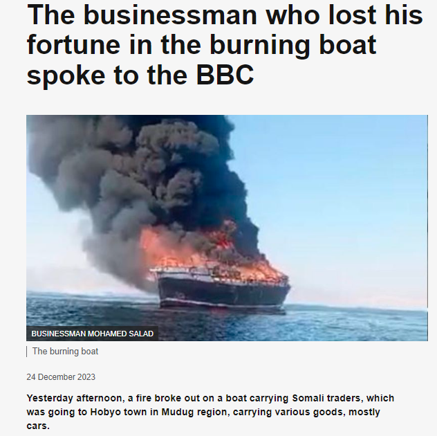 اس رپورٹ کے مطابق 23 دسمبر کو مدوگ کے ہوبیو شہر جاتے ہوئے صومالی تاجروں کا ساز و سامان لے جانے والی کشتی میں آگ لگ گئی تھی۔ مرسل محمد عدان، جو کشتی کے نمائندے تھے، انہوں نے بی بی سی سے گفتگو کے دوران بتایا کہ آگ لگنے کا سبب معلوم نہیں ہو سکا ہے۔