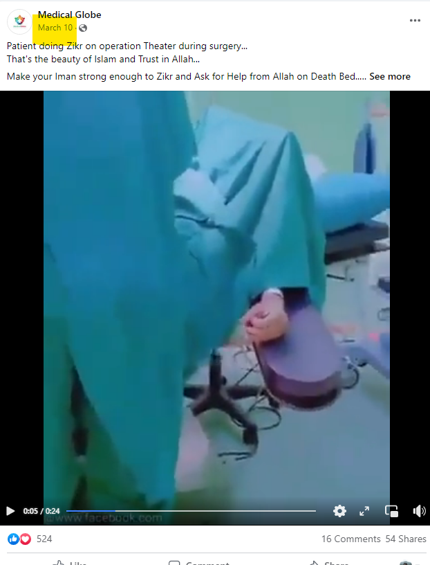 آپریشن تھیئٹر میں ذکرِ الٰہی کرتے ہوئے شخص کی ویڈیو کو ہم نے کیفریم میں تقسیم کیا اور ان میں سے ایک فریم کو گوگل ریورس امیج سرچ کیا۔ اس دوران ہمیں 10 مارچ 2022 کو شیئر شدہ میڈیکل گلوب نامی فیس بک پیج پر ہو بہو ویڈیو ملی۔ جس کے کیپشن کے مطابق ایک مریض آپریشن تھیئٹر میں آپریشن کے دوران ذکر اللہ کر رہا ہے۔ لیکن اس میں کہیں بھی عمران خان کا ذکر نہیں کیا گیا ہے اور یہاں سے یہ بھی واضح ہوتا ہے کہ عمران خان پر حملہ 9 نومبر کو ہوا تھا جبکہ ویڈیو کو تقریبا 8 ماہ پہلے بھی شیئر کیا گیا ہے۔