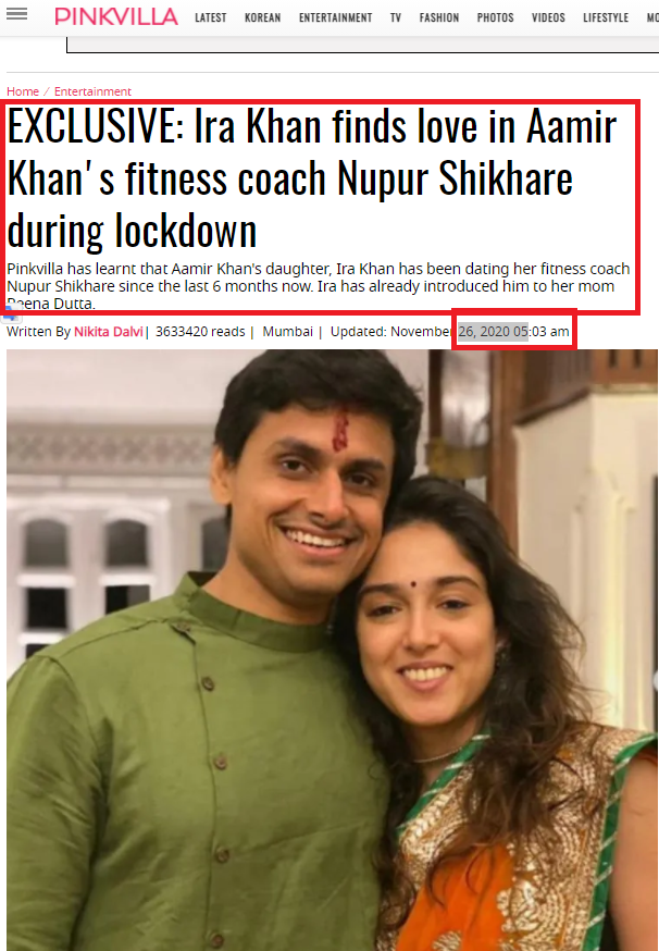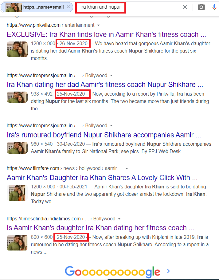 پھر ہم نے ایرا اور نپُر سے متعلق کچھ گوگل کیورڈ سرچ کیا۔ جہاں ہمیں انڈیاڈاٹ کام اور پنک ویلا پر شائع 25-26 نومبر2020 کی خبریں ملیں۔ جس کے مطابق ایرا اور نپُر شکارے لاک ڈاؤن کے دوران ایک دوسرے کے نزدیک آئے تھے اور اس کے بعد سے ہی وہ دونوں ڈیٹ کررہے ہیں۔ لیکن دونوں نے اپنے اس رشتے کے بارے میں کسی بھی طرح کا آفیشل اعلان نہیں کیا ہے۔ رپوٹ کی مانیں تو نپر عامر خان کی شادی کی سال گرہ میں پہنچے تھے۔ کئی تہوار بھی نوپر اور ایرا نے اپنے کچھ خاص دوستوں کے ساتھ منائے ہیں۔ جس کی کچھ تصاویر بھی ان کے سوشل میڈیا ہینڈل پر موجود ہیں۔
