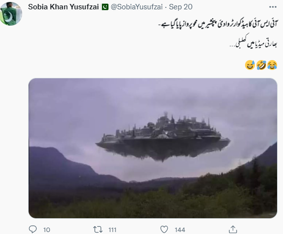 فیس بک اور ٹویٹر پر بھارتی میڈیا کا مذاق اڑاتے ہوئے اسپیس شپ کی ایک تصویر کو خوب شیئر کیا جا رہا ہے۔ صارفین نے تصویر کے ساتھ کیپشن میں لکھا ہے کہ”آئی ایس آئی کا ہیڈکوارٹر وادی پنچشیر میں محو پرواز پایا گیا ہے۔ جس کے بعد بھارتی میڈیا میں کھلبلی”۔بتادوں کہ اس تصویر کو زیادہ تر مزاحیہ طور پر شیئر کیا جا رہا ہے۔