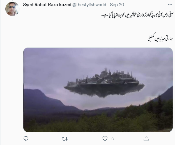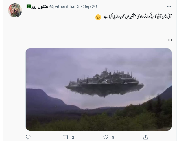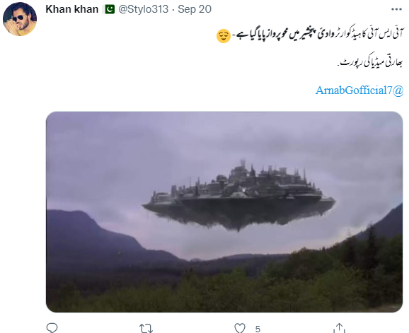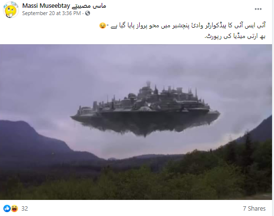 دوسری جانب ان دنوں اسپیس شپ کی ایک تصویر کو بھارتی میڈیا سے منسوب کرکے سوشل نیٹورکنگ سائٹس پر شیئر کیا جا رہا ہے۔ جس میں صارفین کا دعویٰ ہے کہ مذکورہ “اسپیس شپ آئی ایس آئی کاہیڈکوارٹر ہے۔ جو افغانستان کے پنجشیر میں محو پرواز پایا گیا ہے۔ اس خبر کے شائع ہوتے ہی بھارتی میڈیا میں کھلبلی مچ گئی ہے”۔