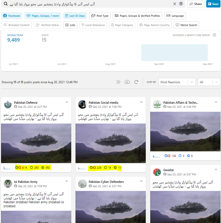 کراؤڈ ٹینگل پر جب ہم نے “آئی ایس آئی کاہیڈکوارٹر وادئ پنچشیر میں محو پرواز پایا گیا ہے” سرچ کیا تو ہمیں پتا چلا کہ اس موضوع پر ستمبر ماہ میں 9,489 فیس بک صارفین تبادلہ خیال کر چکے ہیں۔