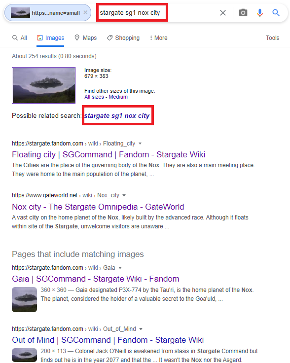 وائرل تصویر کی سچائی جاننے کے لئے ہم نے اپنی تحقیقات کا آغاز کیا۔ سب سے پہلے تصویر کو ہم نے گوگل ریورس امیج سرچ کیا۔ جہاں ہمیں اسکرین پر متعدد لنک فراہم ہوئے۔ ساتھ ہی اسکرین پر انگلش میں “اسٹارگیٹ ایس جی 1 نوکس سٹی” لکھا ہوا نظر آیا۔