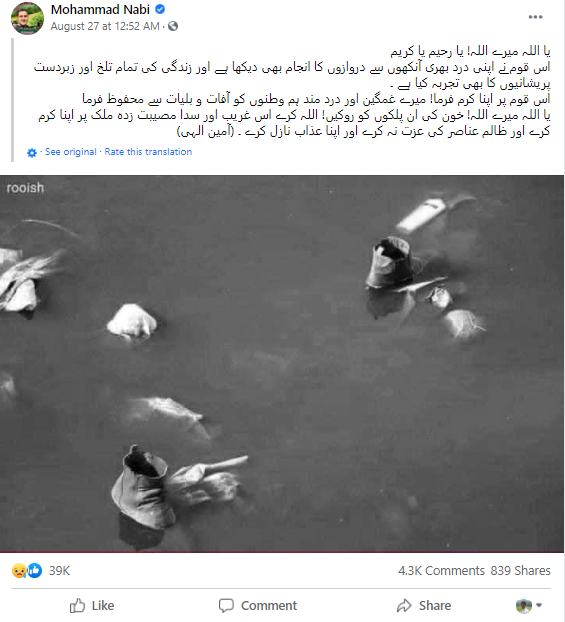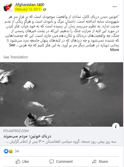 مزید کیورڈ سرچ کے دوران ہمیں 12 فروری 2017 کو شیئر شدہ افغانستان1400 نامی فیس بک پیج کا ایک پوسٹ ملا۔ جس میں وائرل تصویر کے ساتھ فارسی زبان میں کچھ لکھا ہوا تھا۔ جب ہم نے اس کا ترجمہ کیا تو پتا چلا کہ بہتے ہوئے سرخ خون کی تصویر اصلی نہیں ہے بلکہ نقلی ہے۔ دراصل افغانستان 1400 نامی تنظیم نے علامتی طور پر احتجاجی مظاہرہ کیا تھا۔ جس میں کابل کی ایک دریا میں 200 کیلو سرخ رنگ ملایا تھا، یہ تصویر اسی دوران کلک کی گئی تھی۔
