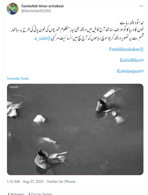بیس سال بعد افغانستان سے امریکی فوج کا انخلاء ہو چکا ہے۔ اس دوران 26 اگست کو کابل ایئرپورٹ پر خود کش حملہ بھی ہوا تھا۔ جس میں متعدد افراد کی جان جا چکی ہے۔ دوسری جانب کابل خود کش حملے سے جوڑ کر خون نما دریا والی تصویر کو اردو، فارسی اور انگلش کیپشن کے ساتھ خوب شیئر کیا جا رہا ہے۔ جس میں سرخ پانی اور دیگر اشیاء تیرتے ہوئے نظر آرہے ہیں۔ صارفین کا دعویٰ ہے کہ یہ خون کا دریا کابل ایئرپورٹ پر ہونے والے دہشت گرد حملے کے بعد کا ہے۔