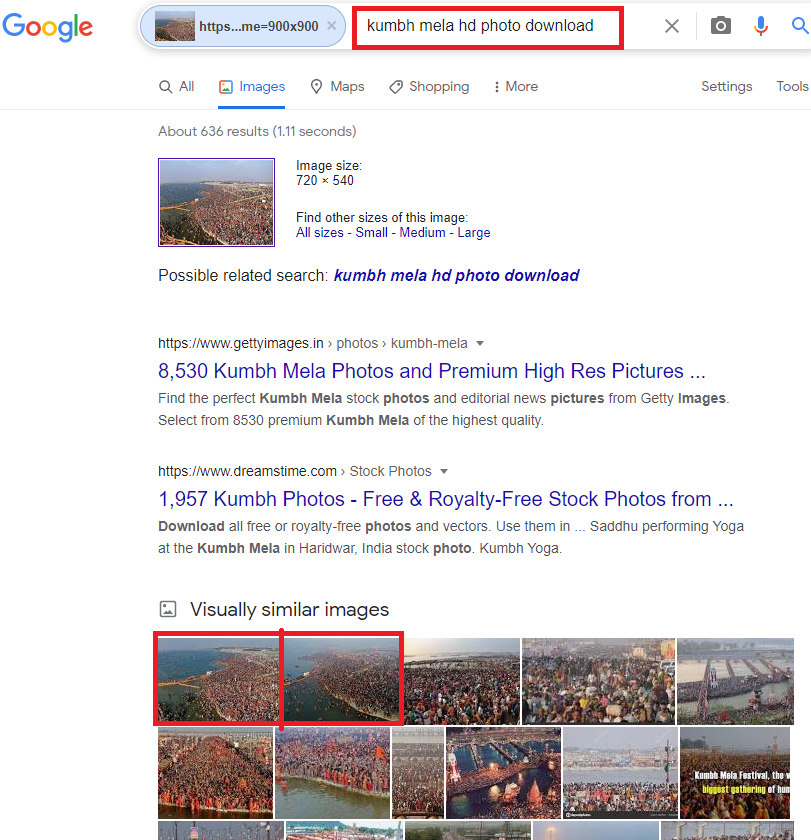 سوشل میڈیا پر ہریدوار کے نام سے وائرل تصویر کی سچائی جاننے کےلئے ہم نے سب سے پہلے تصویر کو گوگل ریورس امیج سرچ کیا۔ اس دوران ہمیں اسکرین پر ملی جانکاری سے پتا چلا کہ وائرل تصویر پریاگ راج کمبھ میلے کی ہے۔