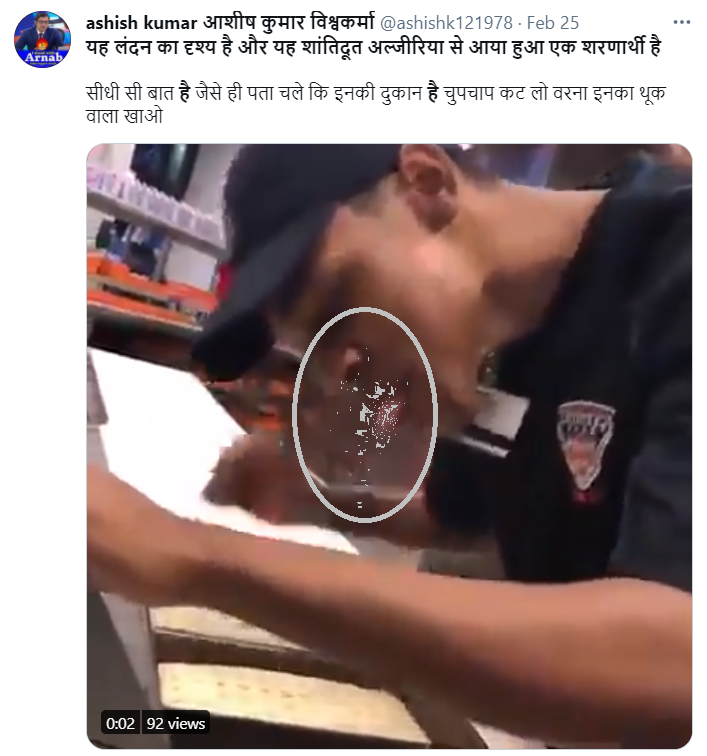 سوشل میڈیا پر تین سیکینڈ کا ایک ویڈیو خوب گردش کررہا ہے۔جس میں ایک شخص پِزّا پر تھوکتے ہوئے نظر آرہاہے۔ یوزر کا دعوی ہے کہ لندن میں الجیریا کا مسلم تاریکین وطن ہے۔جو کھانے میں تھوک رہا ہے۔ مزید لکھا ہے کہ مسلمانوں کی دوکان جہاں دکھے وہاں بالکل نا جاؤ۔