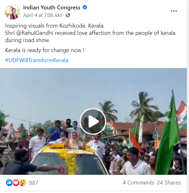 پھر ہم نے وائرل ویڈیو سے متعلق کچھ کیورڈ سرچ کیا۔ اس دوران ہمیں انڈین یوتھ کانگریس کے فیس بک پیج پر بیس سیکینڈ کا وائرل ویڈیو ملا۔ ویڈیو کے ساتھ دی گئی جانکاری کے مطابق یہ ویڈیو کیرلہ کے کوزی کوڑا میں ہوئے روڈ شو کا ہے۔ بتادوں کہ اس ویڈیو کو 4 اپریل کو فیس بک پر شیئر کیا گیا تھا۔