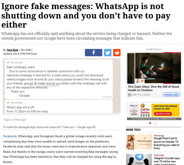 واہٹس ایپ رات 11:30 سے صبح 6 بجے تک بند رہے گا۔ اس دعوے کی سچائی جاننے کے لئے ہم نے جب کیورڈ سرچ کیا تو ہمیں انڈین ایکسپریس اور دی پرنٹ کی ویب سائٹ پر 4 اور 6 جولائی 2019 کی خبریں ملیں۔ جس کے مطابق واہٹس بند ہونے یا اس کے استعمال کے لئے پیسے دینے والے وائرل میسج گمراہ کن ہیں۔