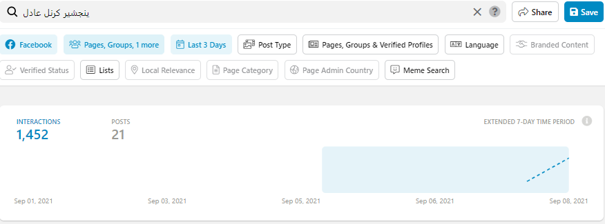 کراؤڈ ٹینگل پر جب ہم نے “پنجشیر کرنل عادل” سرچ کیا تو ہمیں پتا چلا کہ اس موضوع پر محض پچھلے 3 دنوں میں 1,452 فیس بک صارفین تبادلہ خیال کر چکے ہیں۔